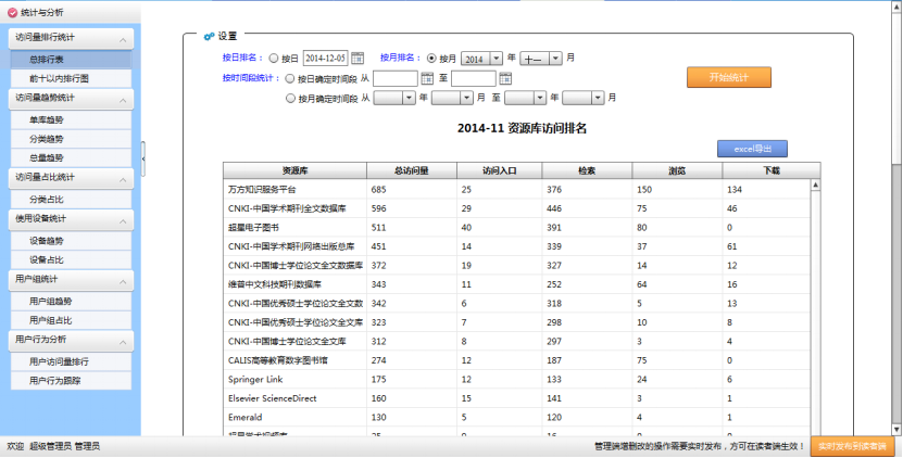 點(diǎn)擊菜單【統計與分析>>用戶(hù)行為分析>>用戶(hù)訪(fǎng)問(wèn)量排行】,打開(kāi)用戶(hù)訪(fǎng)問(wèn)量排行表的設置頁(yè)面。用戶(hù)訪(fǎng)問(wèn)量排行可以詳細了解每一位用戶(hù)的總訪(fǎng)問(wèn)量,并且可以了解其檢索和下載等行為的次數。查看排行時(shí),選擇相應的時(shí)間段即可統計(如下圖)。