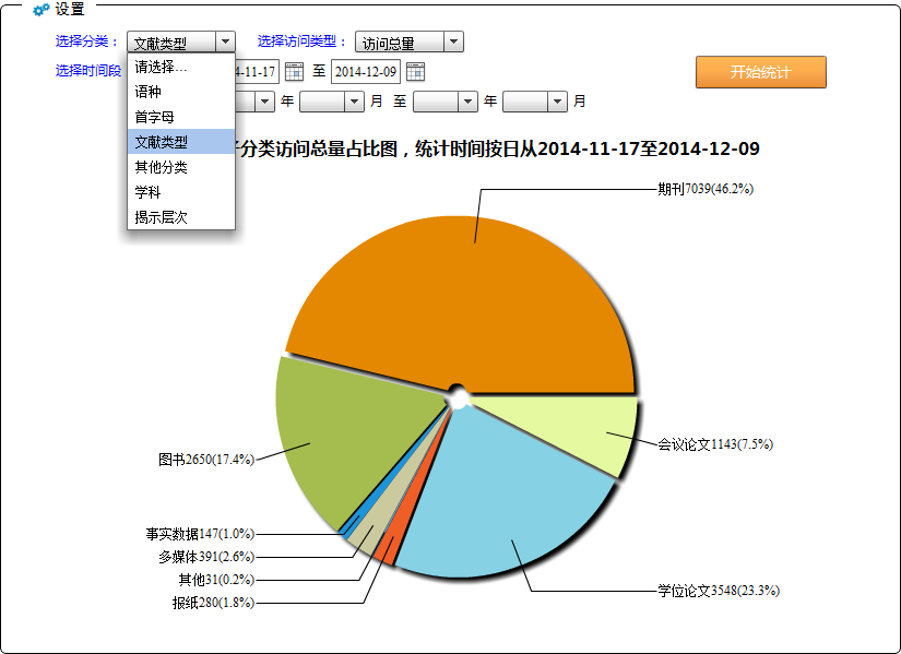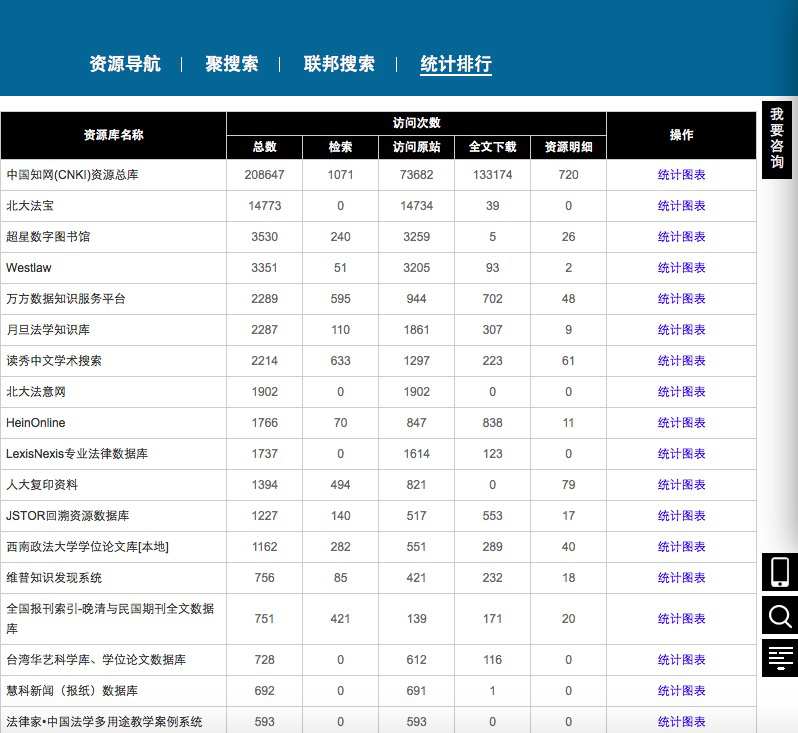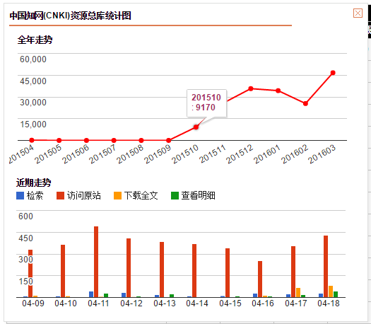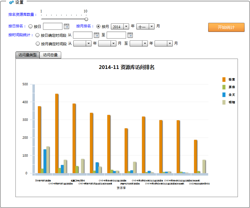 提供電子資源庫的使用統計分析,包括訪(fǎng)問(wèn)量排行統計、趨勢統計、占比統計,全文下載量統計,以及用戶(hù)訪(fǎng)問(wèn)量統計??缮删赖慕y計圖表,便于館員掌握資源庫的使用情況,可為資源的評估提供參考依據。每天生成資源庫的日訪(fǎng)問(wèn)量統計,前端自動(dòng)更新相應圖表,目前展現有“資源庫日訪(fǎng)問(wèn)量TOP”、“日訪(fǎng)問(wèn)總量各類(lèi)型占比”、“日訪(fǎng)問(wèn)總量近期走勢”,美觀(guān)實(shí)用。